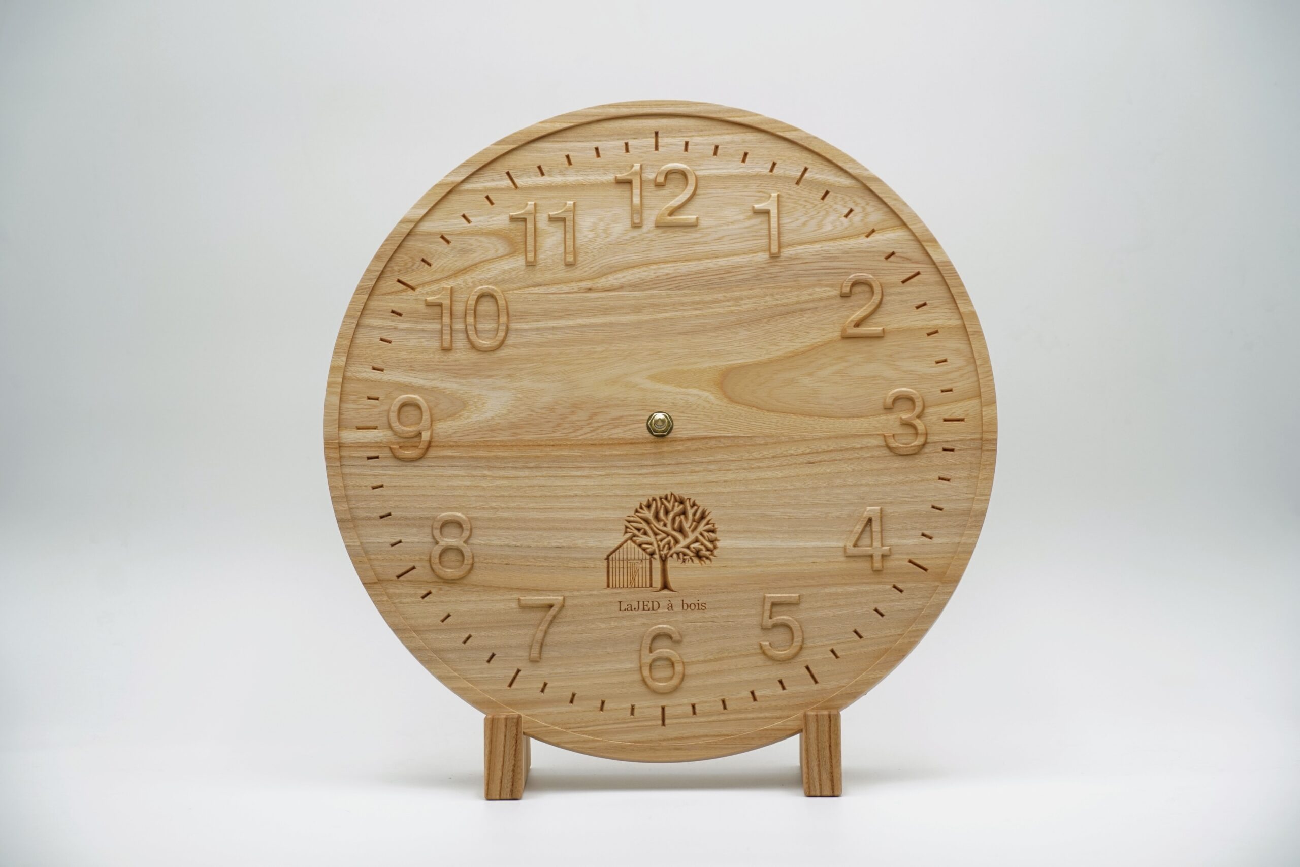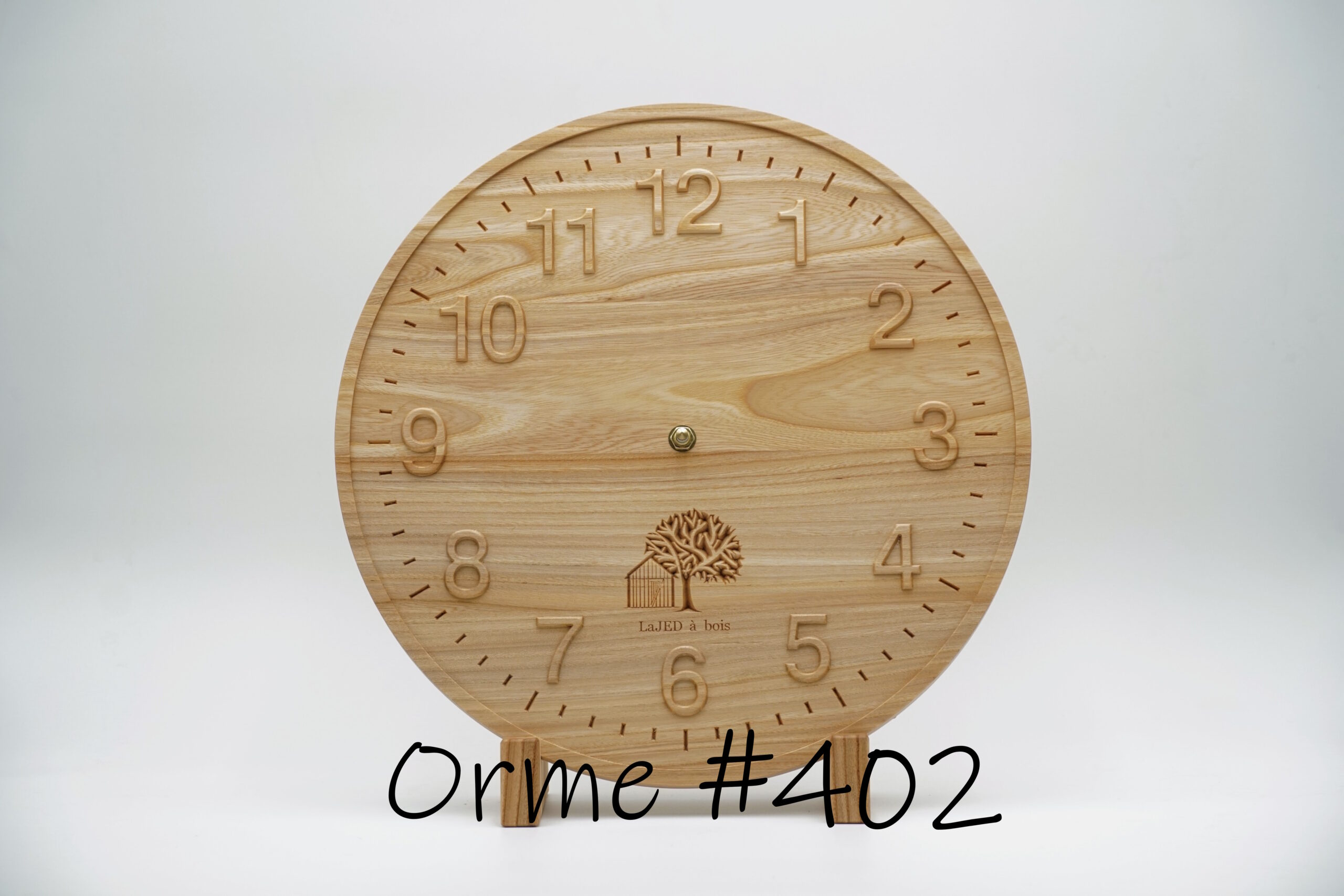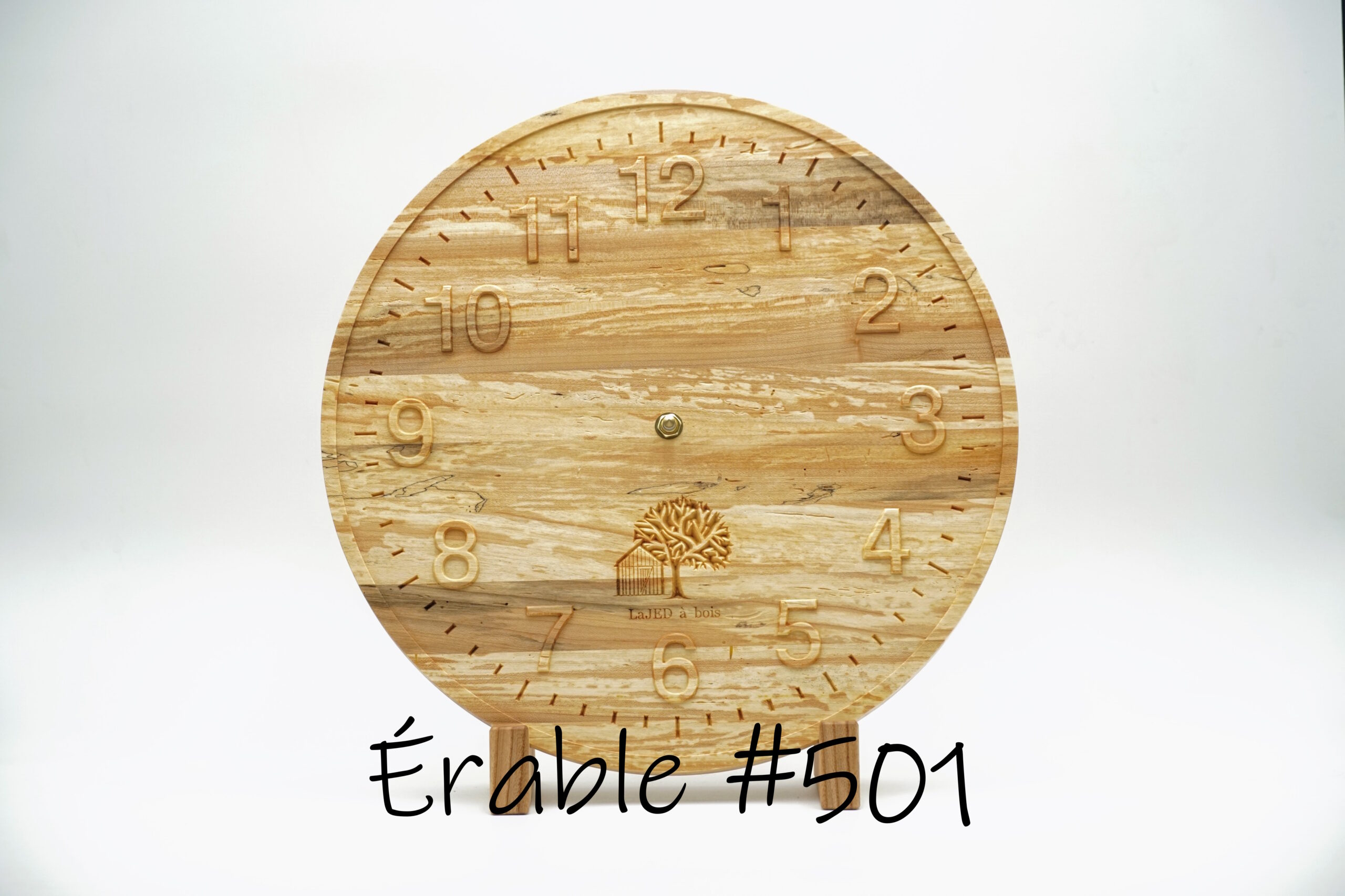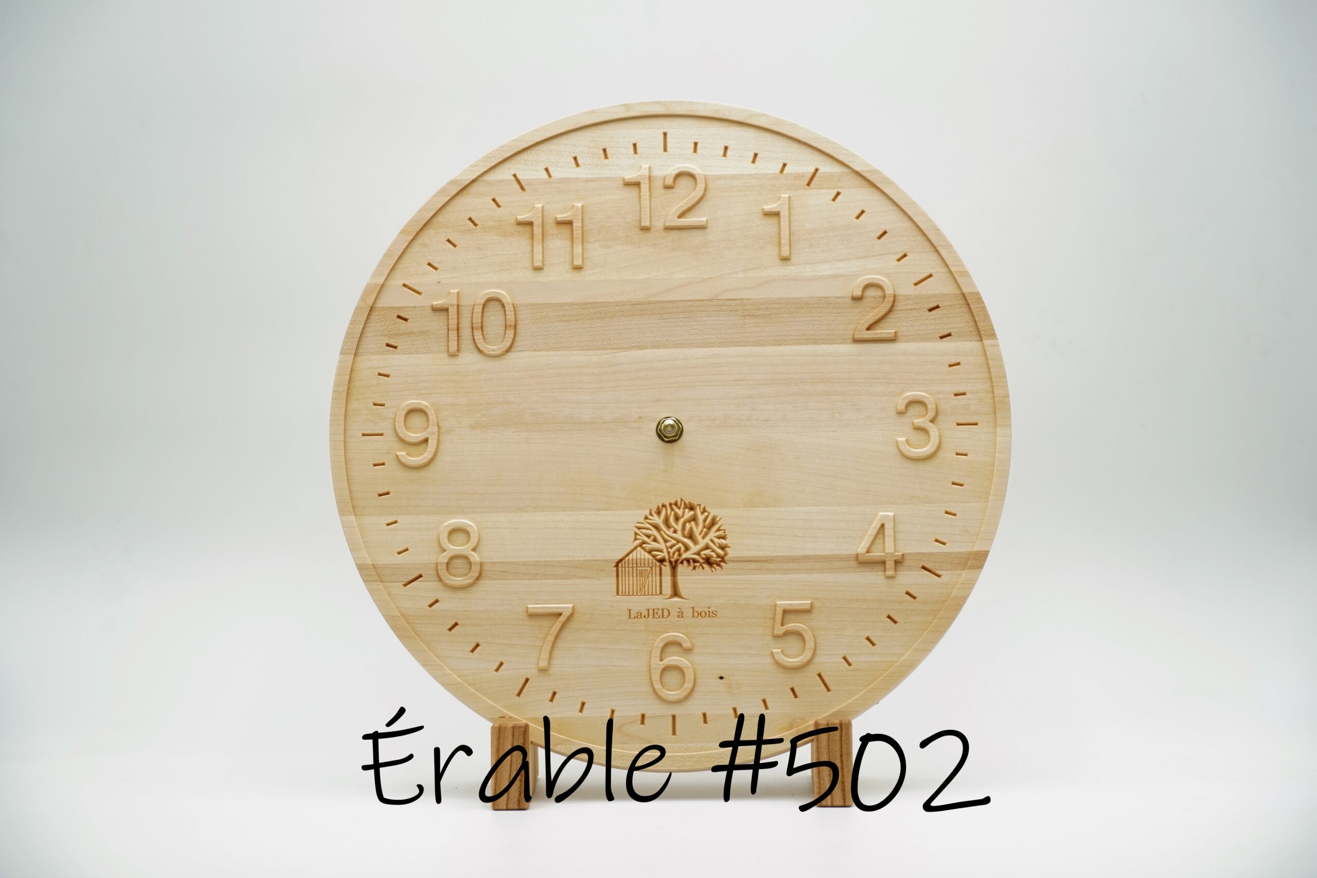 Horloge murale de conception et de fabrication québécoise, réalisée à partir d’un unique plateau de bois local. Les chiffres sont sculptés directement dans le bois.