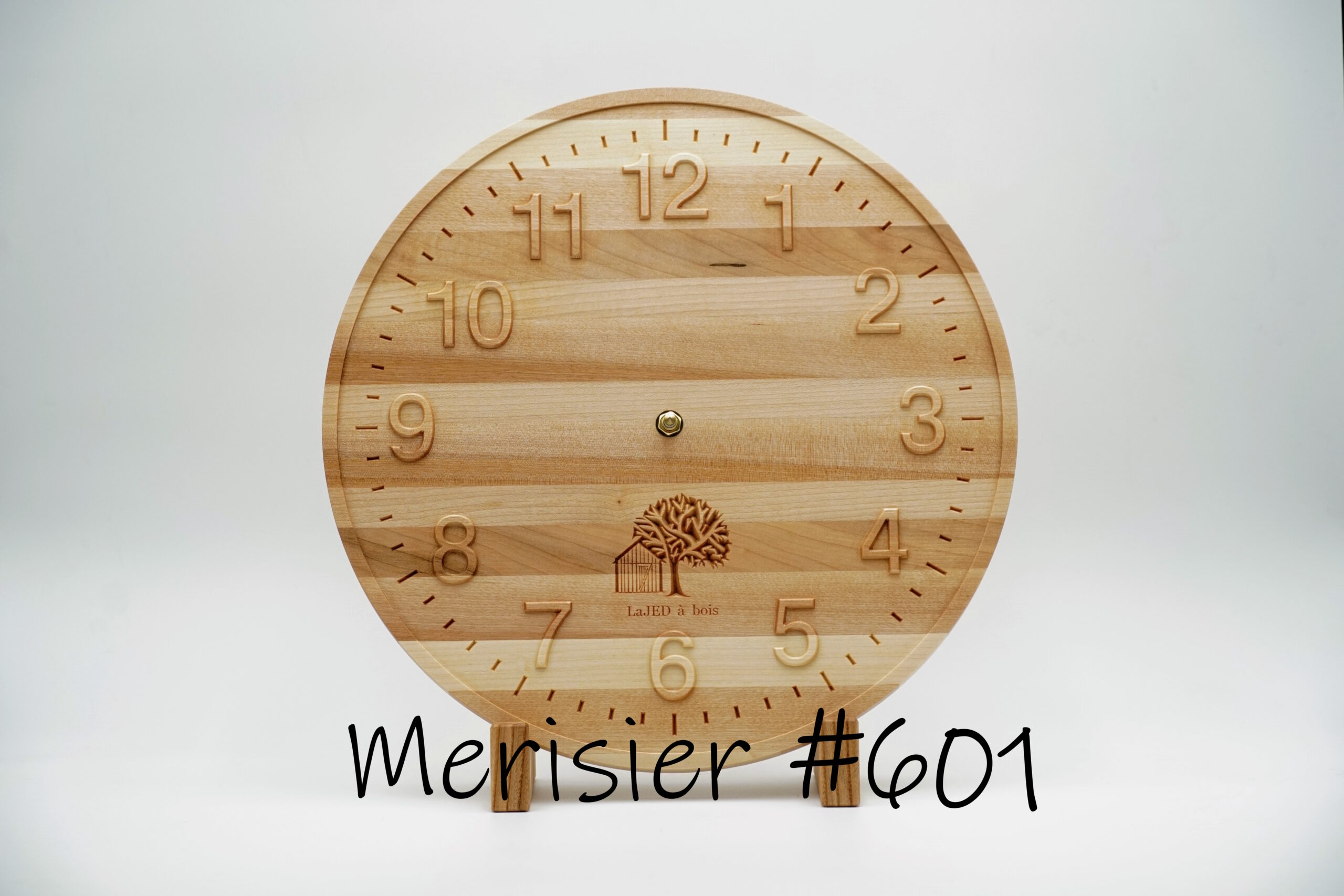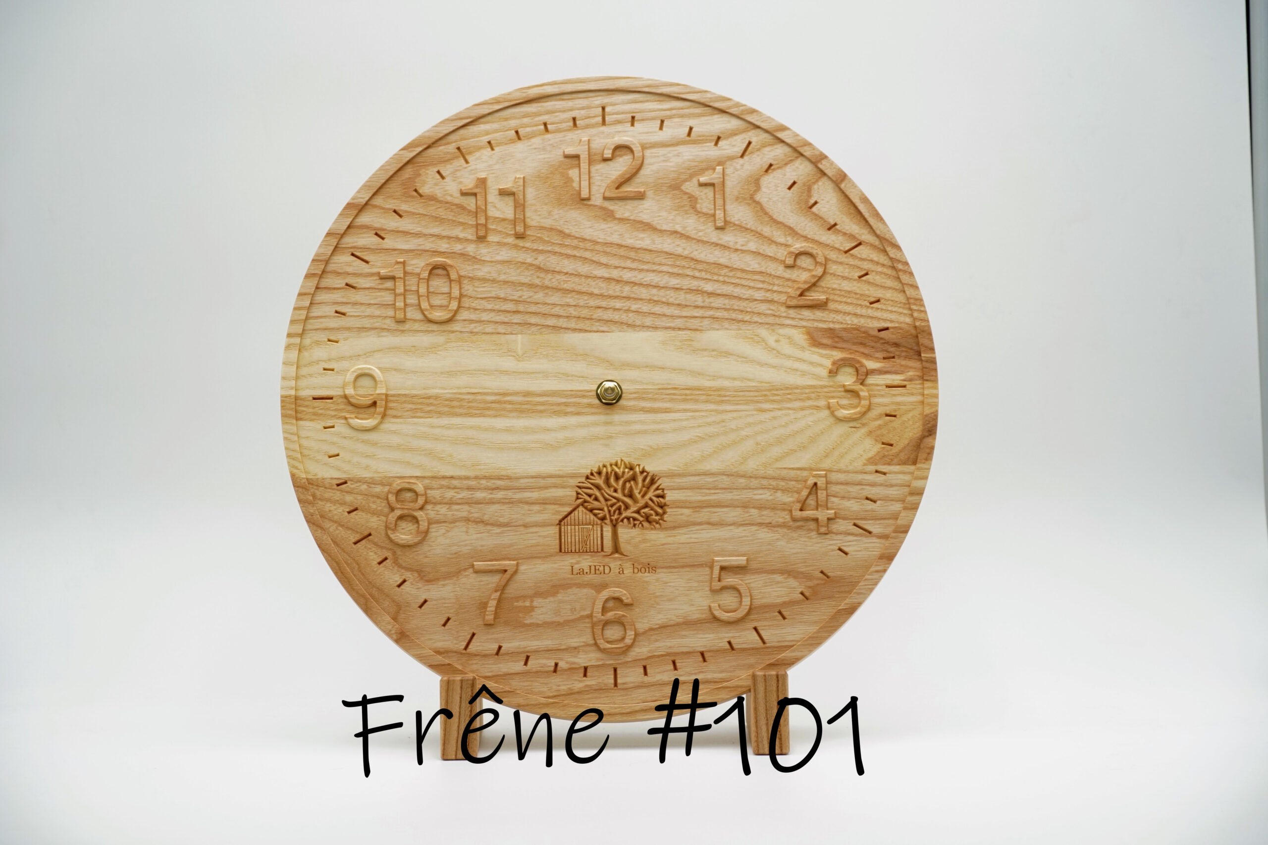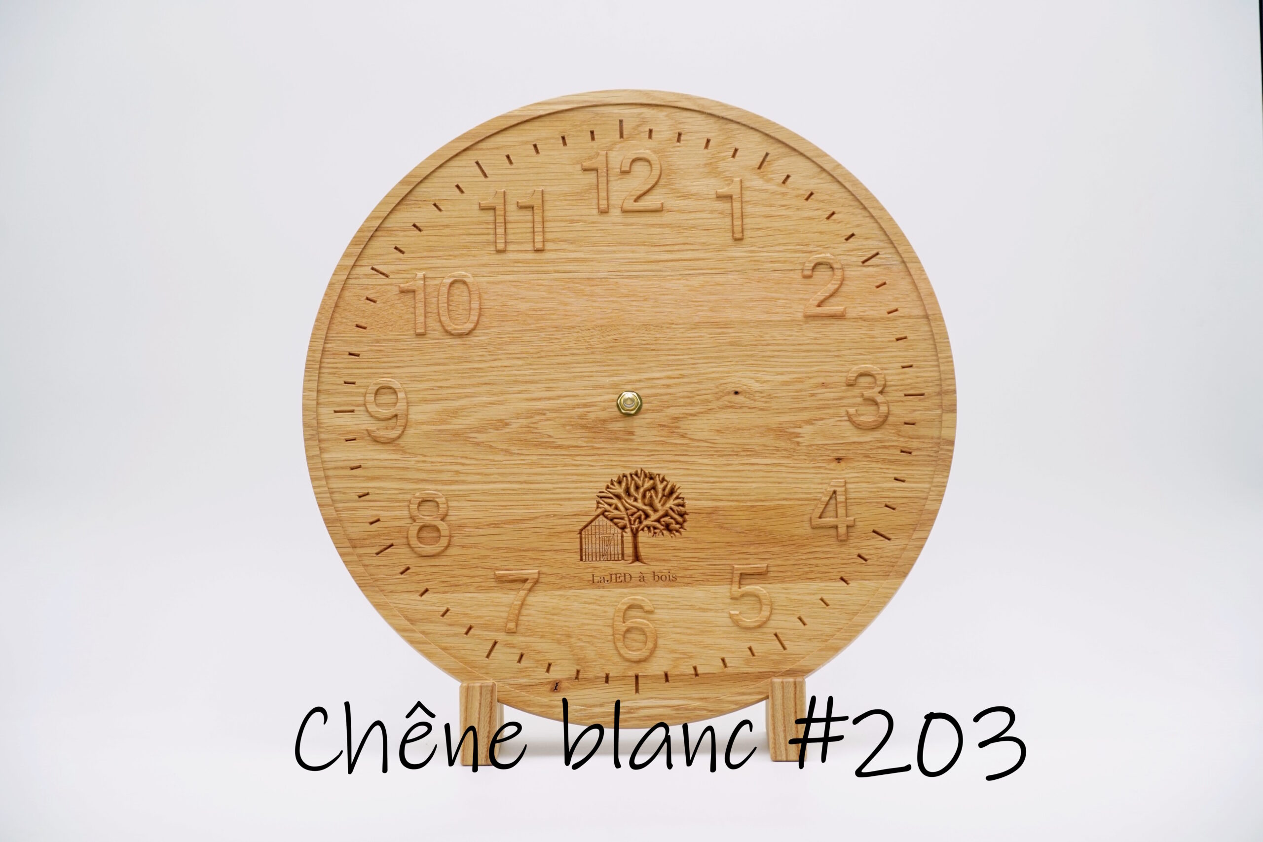 Horloge murale de conception et de fabrication québécoise, réalisée à partir d’un unique plateau de bois local. Les chiffres sont sculptés directement dans le bois.