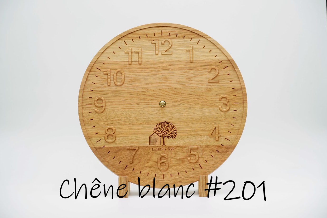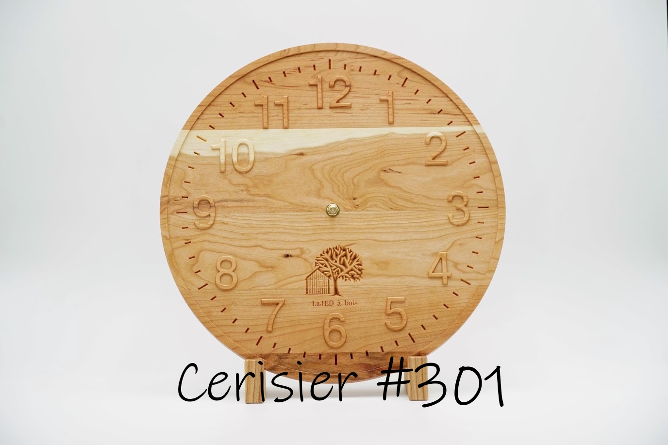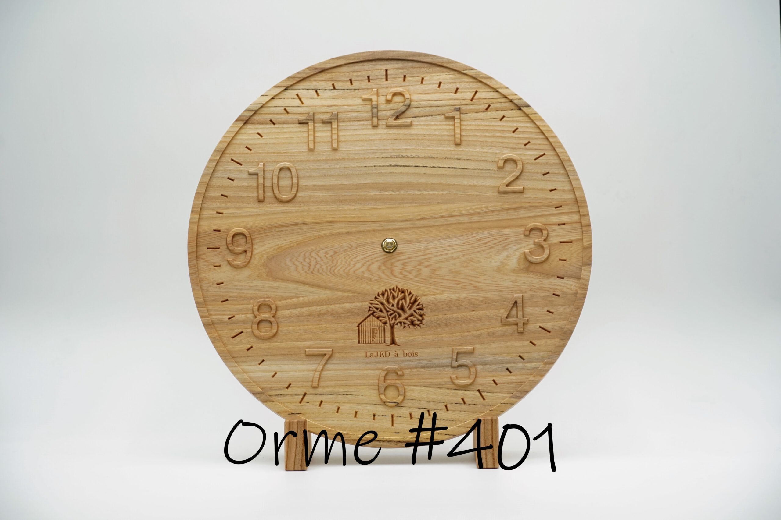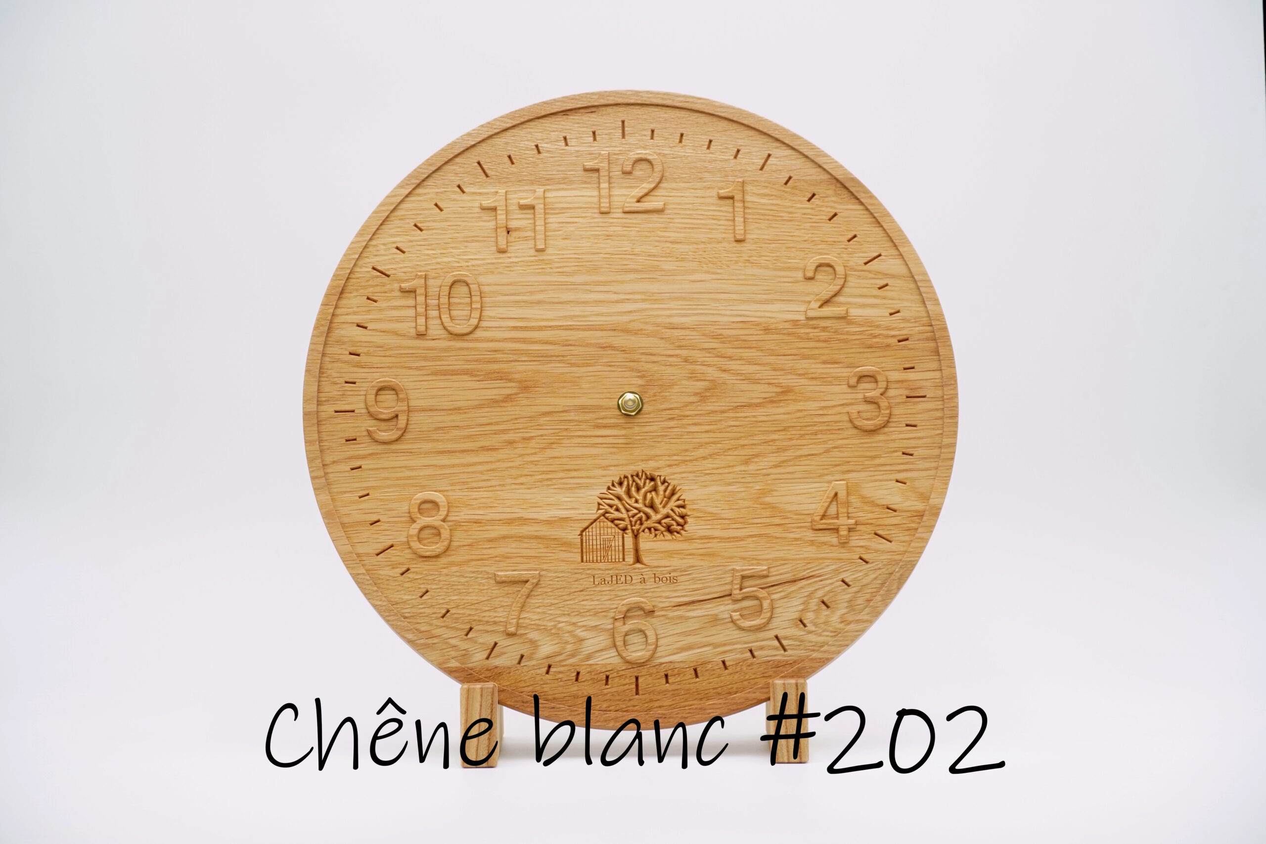 Horloge murale de conception et de fabrication québécoise, réalisée à partir d’un unique plateau de bois local. Les chiffres sont sculptés directement dans le bois.
